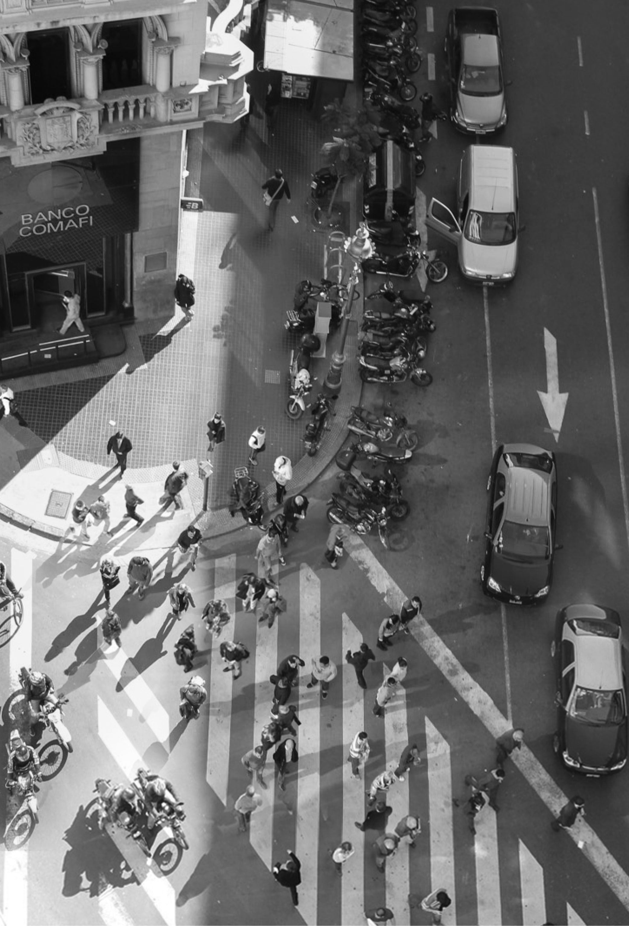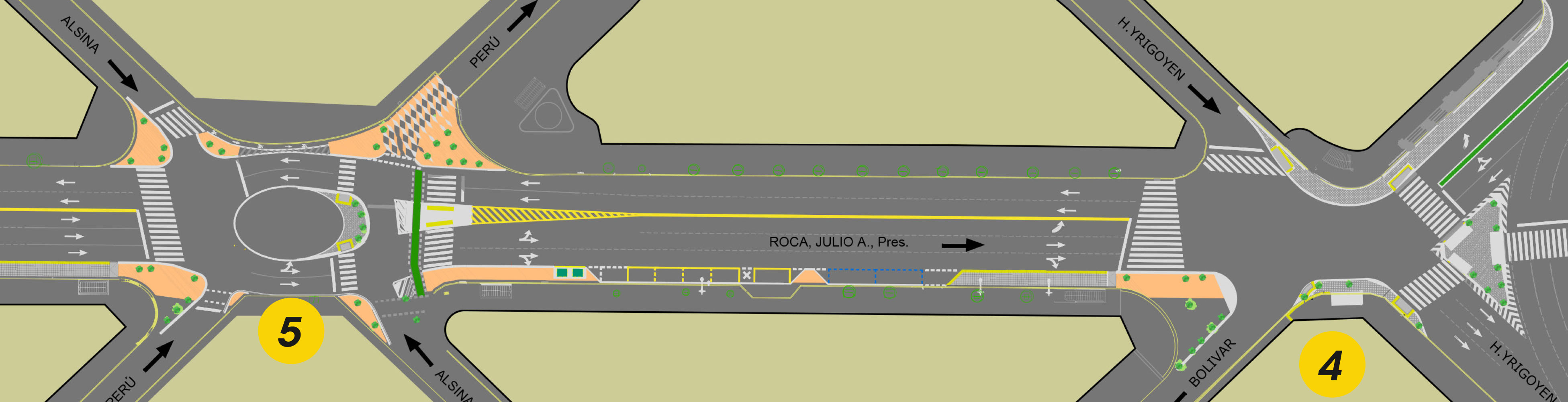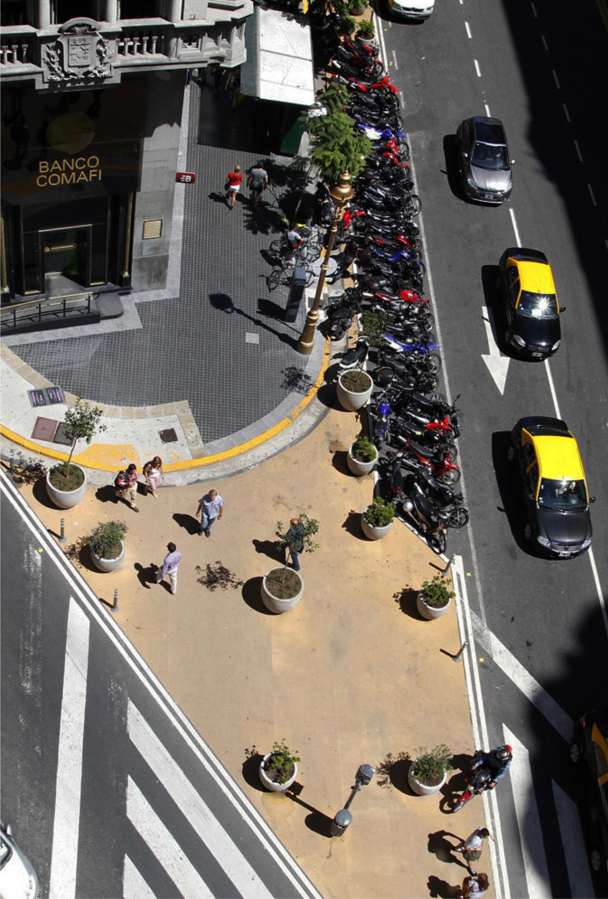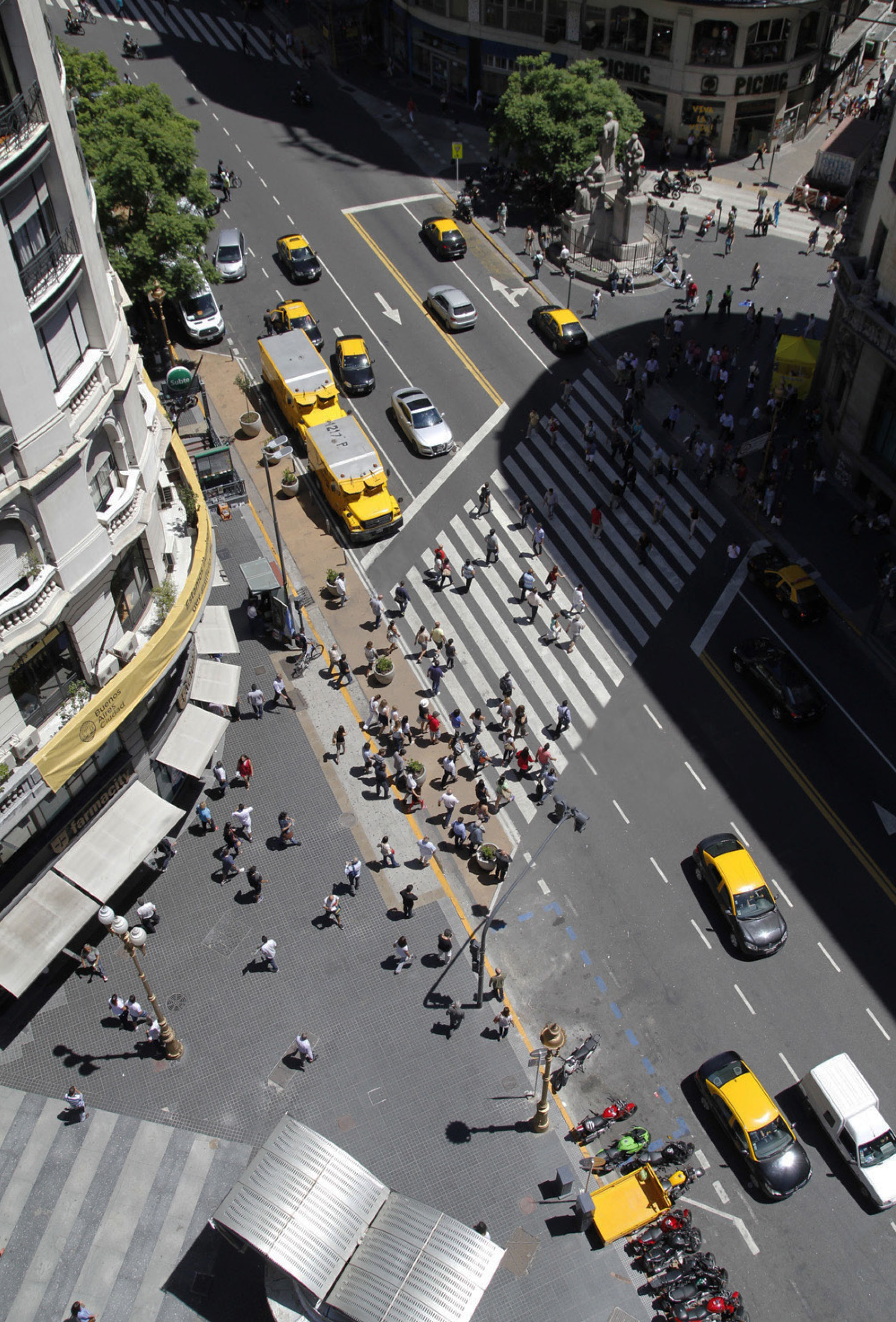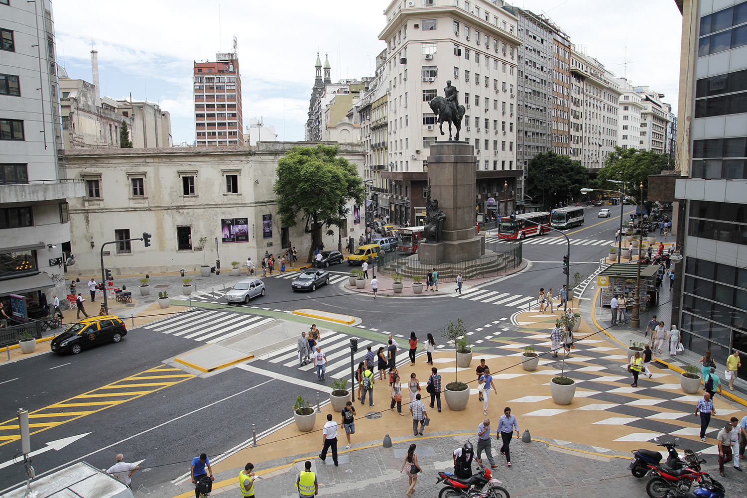Diagonal Sur and Diagonal Norte are two diagonal streets that cut through the grid of Buenos Aires in the heart of the city, and they are two of the most heavily traveled streets for pedestrians. Diagonal streets create challenging intersections for pedestrians, and interventions along these streets sought to expand pedestrian space, slow down traffic, and make crossing the street safer and more comfortable.