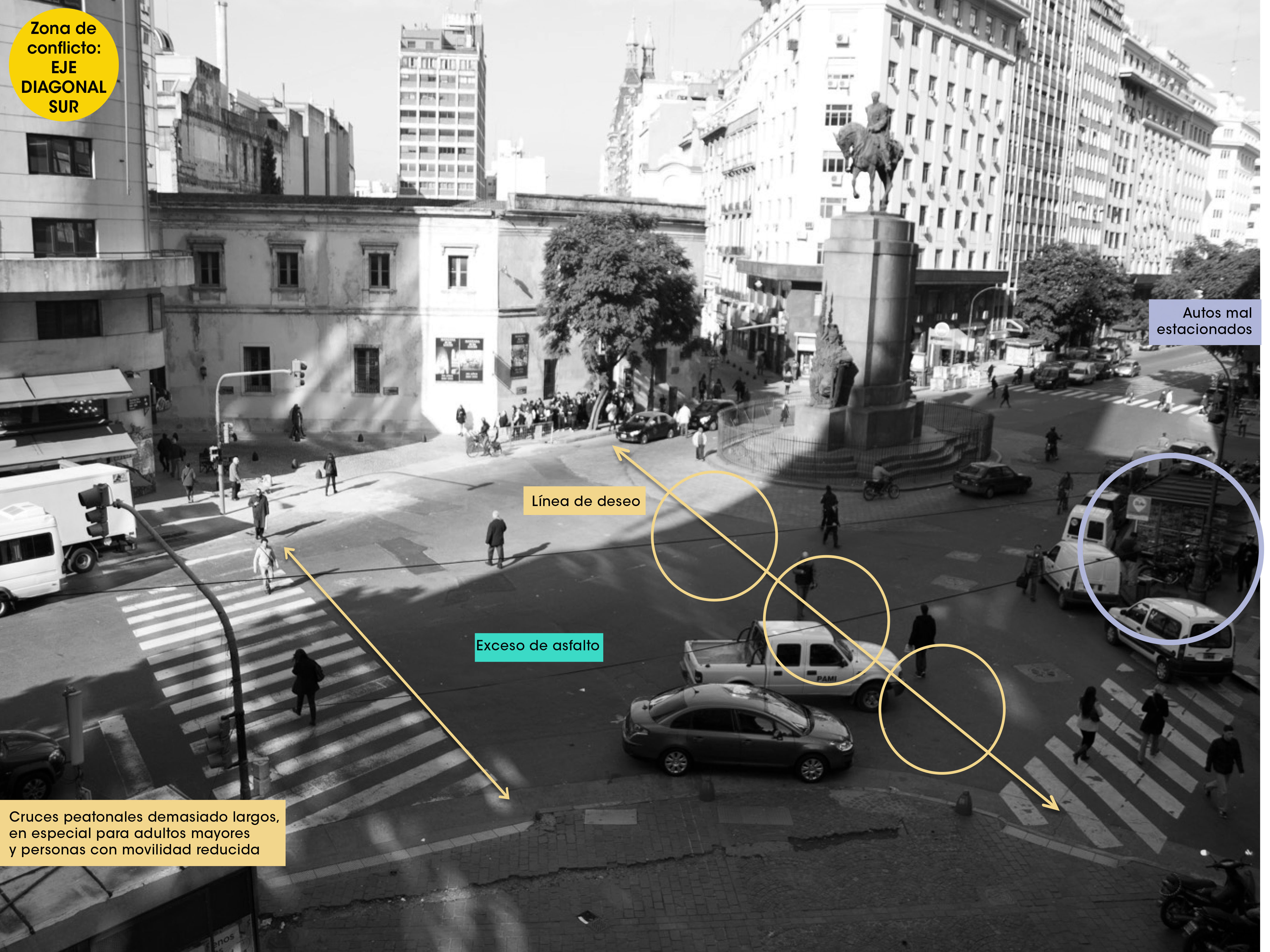 This image highlights the original conditions at the intersection of Diagonal Sur and Peru, where the Monument to Roca towers over the intersection. The view highlights missing crosswalk connections, long crossing distances for pedestrians, large expanses of asphalt, and cars parked everywhere.