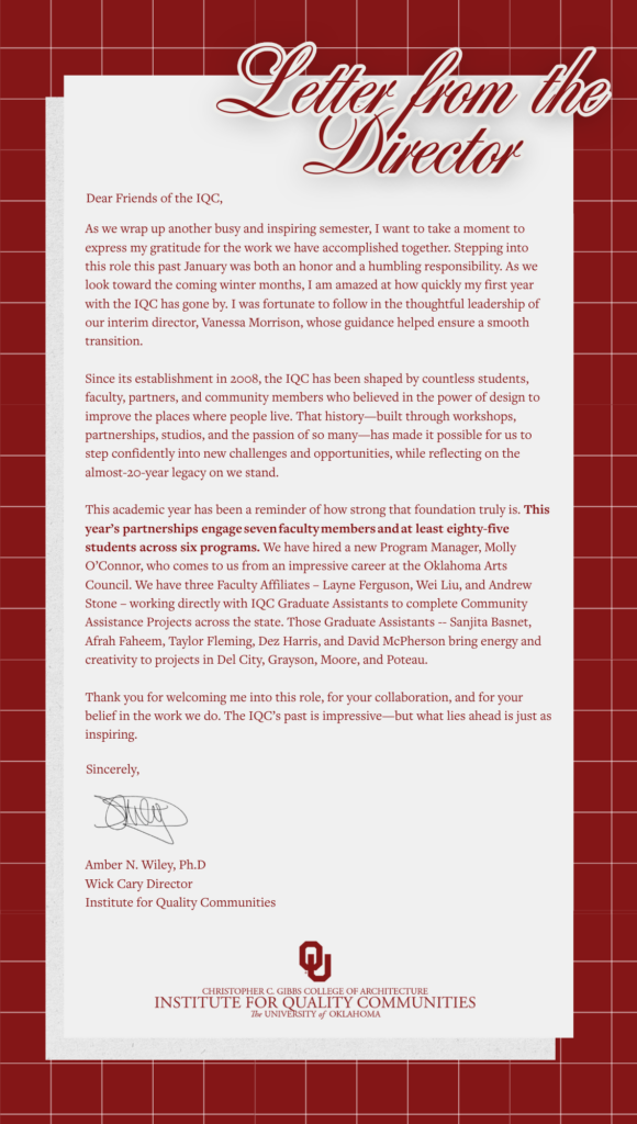 This academic year has been a reminder of how strong that foundation truly is. This year’s partnerships engage seven faculty members and at least eighty-five students across six programs. We have hired a new Program Manager, Molly O’Connor, who comes to us from an impressive career at the Oklahoma Arts Council. We have three Faculty Affiliates – Layne Ferguson, Wei Liu, and Andrew Stone – working directly with IQC Graduate Assistants to complete Community Assistance Projects across the state. Those Graduate Assistants – Sanjita Basnet, Afrah Faheem, Taylor Fleming, Dez Harris, and David McPherson – bring energy and creativity to projects in Del City, Grayson, Moore, and Poteau.